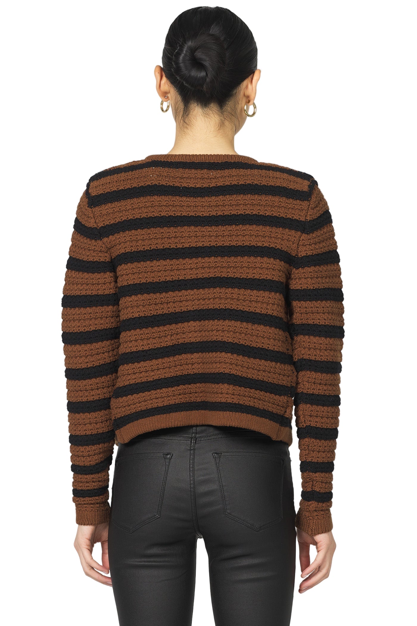 Cambria button up long sleeve cardigan sweater in stripe yarn, designed for comfort and style.