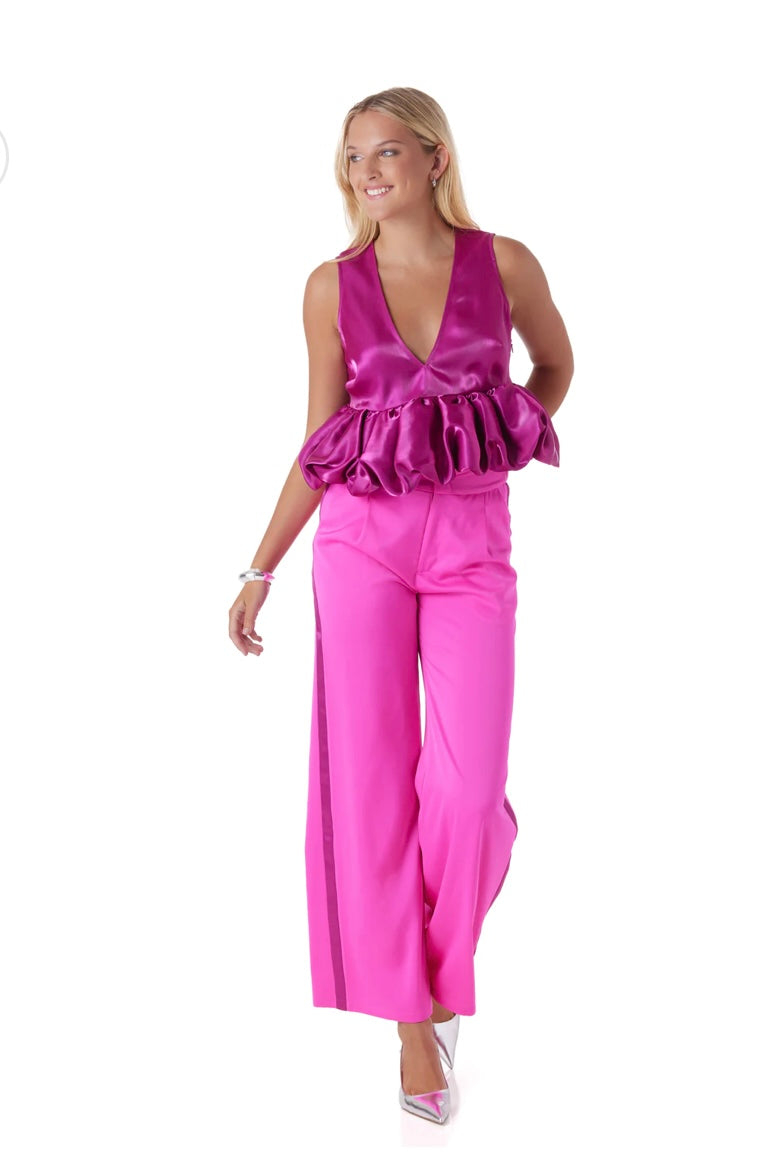 Elevate your style with our new trousers! Cora is a wide-leg, floor-length trouser with a front zipper and elasticized back waistband. The Mollie Pink colorway features a fun metallic pink tuxedo stripe.