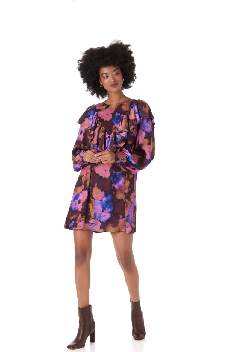 The Miles Dress is back in bold new prints! This a-line mini is perfect for the holiday season. We love her cuffed sleeves and ruffle trim!