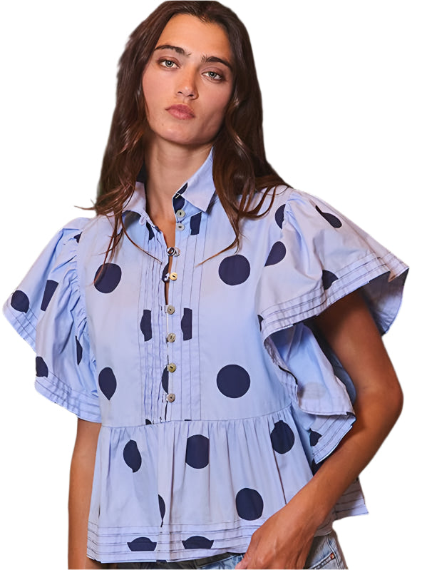 This daring top features playful ruffle sleeves and delicate pintuck details that elevate its classic polka dot print. The short flutter sleeves and collared, button-up front add a touch of bold sophistication, while the babydoll design creates a flattering, free-spirited silhouette perfect for making a statement.