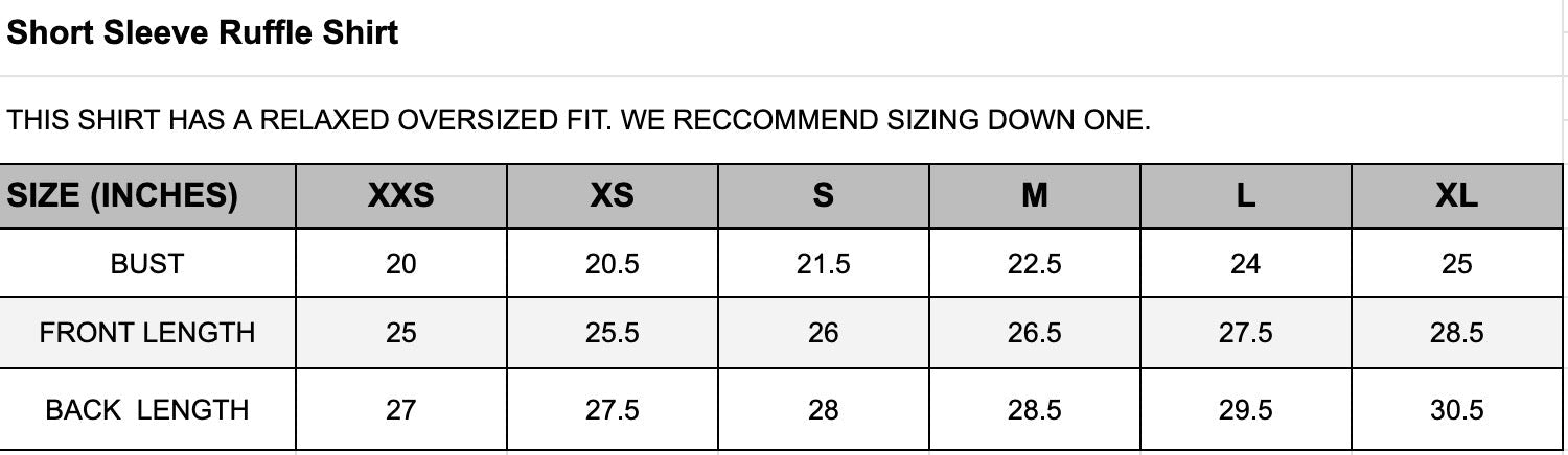 Chic, timeless, and oh-so-versatile—our White Short Sleeve Ruffle Collar Shirt is a wardrobe must-have! Featuring a playful ruffle neckline and a flattering fit, this best-seller pairs perfectly with everything from jeans to skirts. Designed for effortless style and all-day comfort, it’s the piece you’ll reach for on repeat.