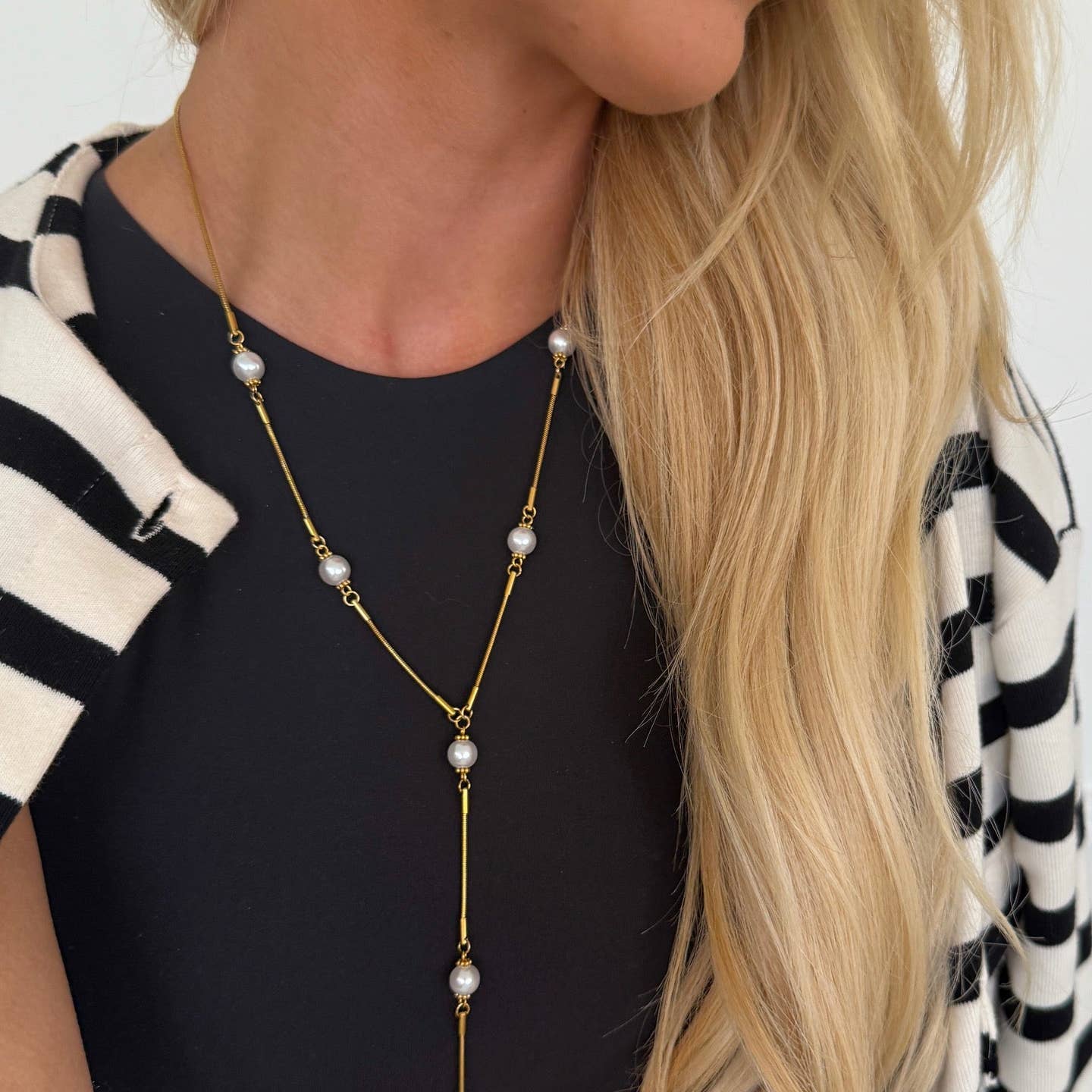 Elevate your look with this daring gold and pearl lariat necklace, designed to stand out whether worn solo or layered.