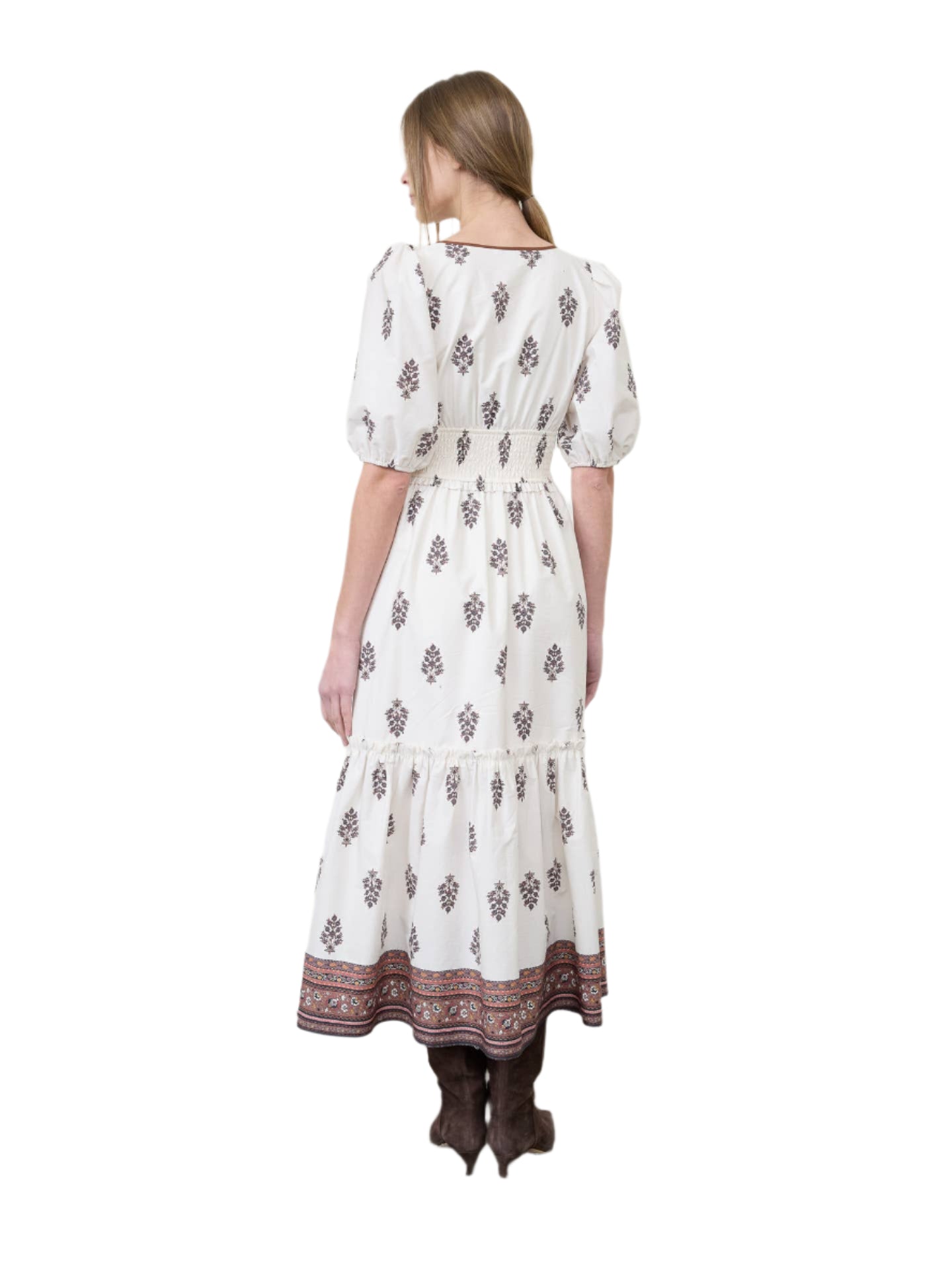 This playful midi dress features charming puff sleeves and a flattering smocked waist that enhances your silhouette. The front tie detail adds a flirty touch, while the ruffle hem and trim bring a fun, feminine vibe. Adorned with a delicate floral pattern and a stylish border print, it’s perfect for sunny days and special occasions alike.