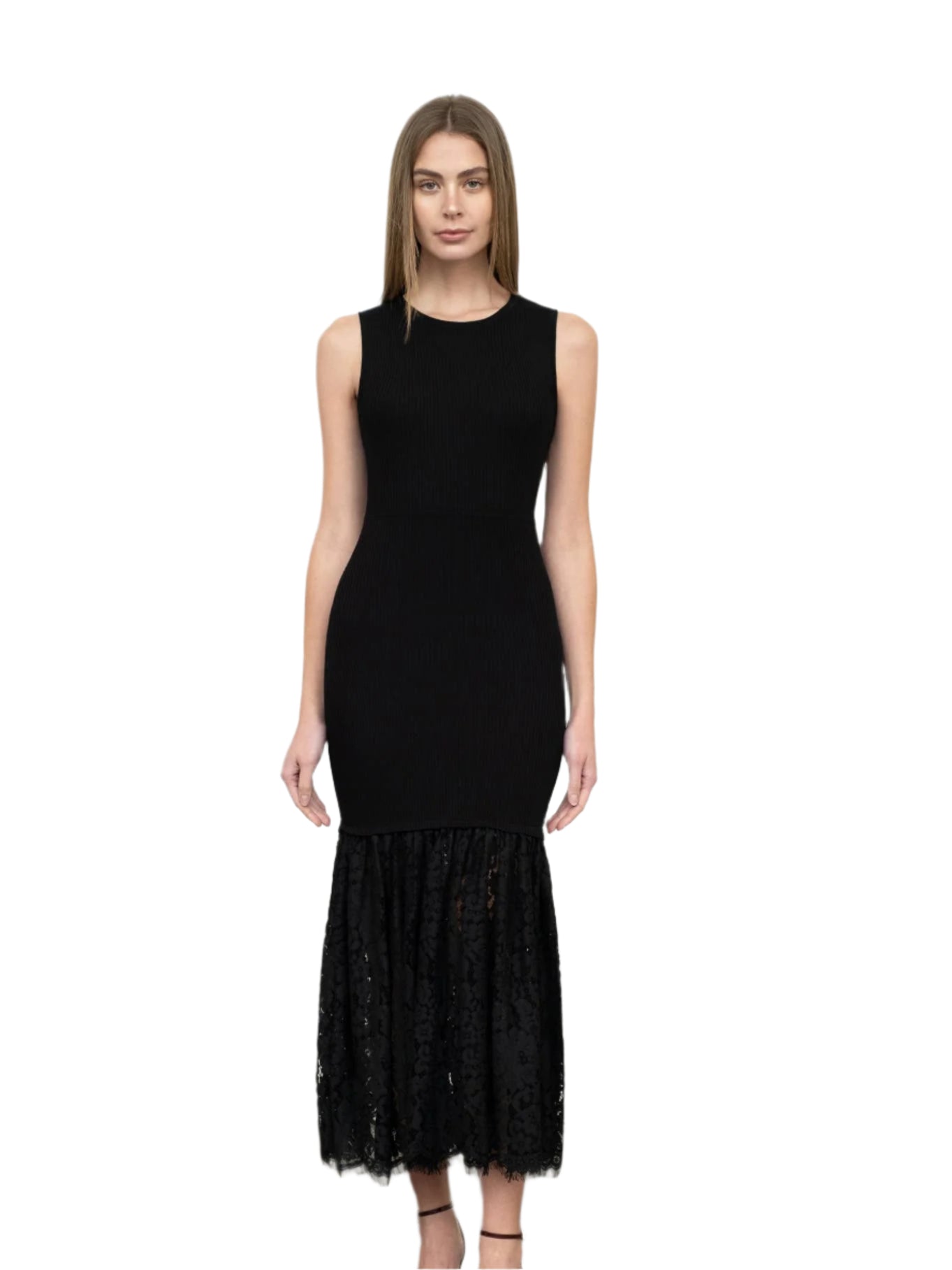 This playful bodycon dress features a cozy sweater knit pattern and a delicate lace hem that adds a flirty touch. With its sleeveless design and round neckline, it’s perfect for showing off your style while staying comfortable. The solid color makes it easy to dress up or down for any occasion.